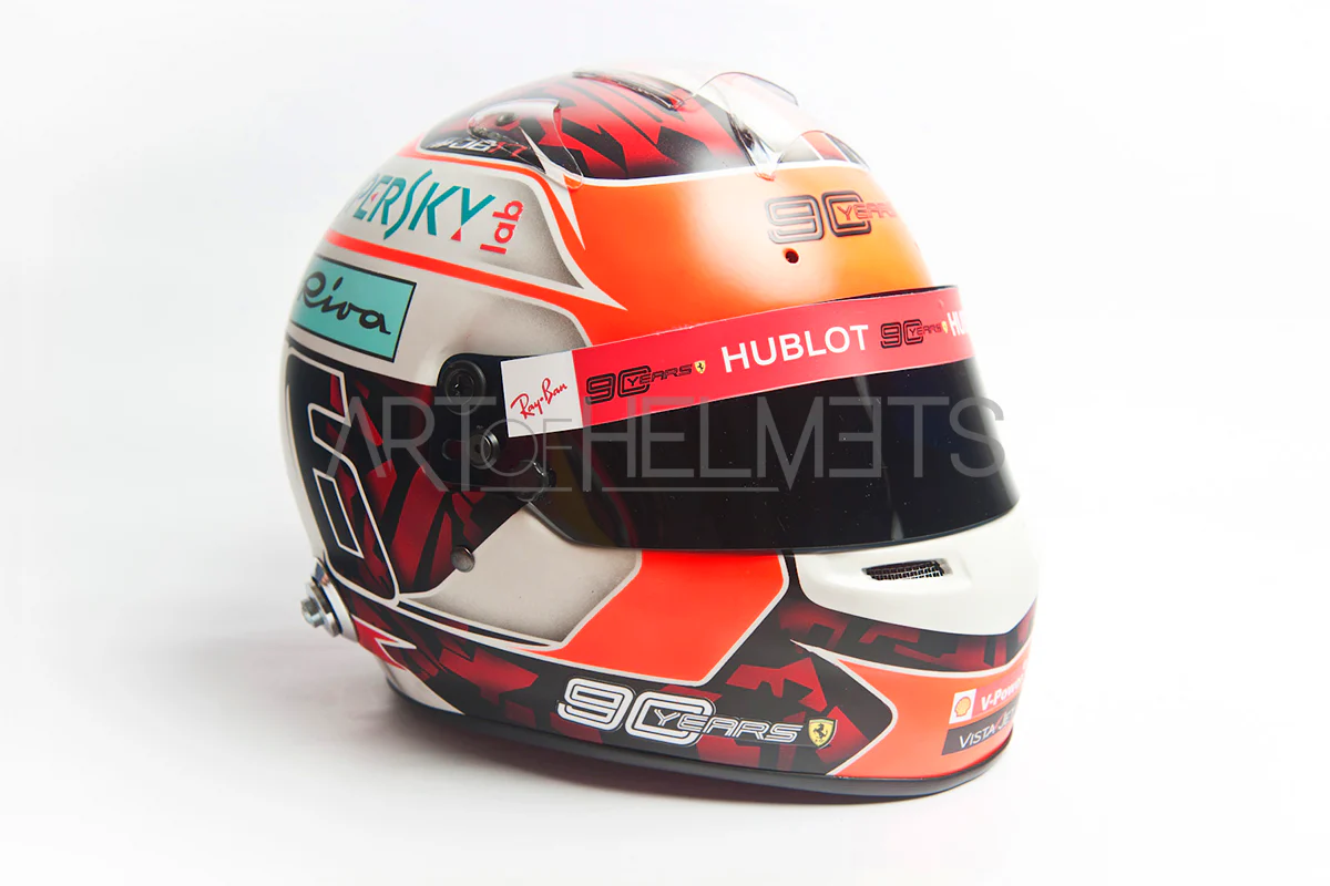 Featuring the driver's national colours of white and red, as well as sporting Team emblems, sponsorship logos and of course the driver's racing number, 16, "90 years" inscribed on their designs. this helmet could be the perfect addition to your F1 collection.