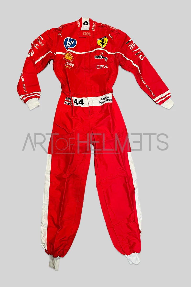 A full-scale replica of the race suit worn by Lewis Hamilton during his debut season with Scuderia in 2025. This striking suit features Ferrari’s iconic red livery, detailed sponsor logos, and authentic design elements seen throughout the season.
